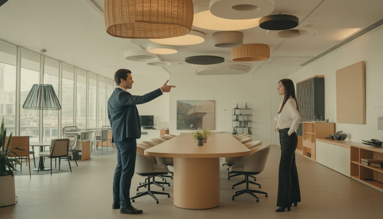 Em alguns projetos, um forro acústico pode ser a opção ideal — especialmente se o ambiente comportar uma solução mais contínua e se houver interesse em esconder instalações (dutos, cabos, iluminação). O ponto-chave é especificar o material certo para absorver nas frequências típicas da fala.