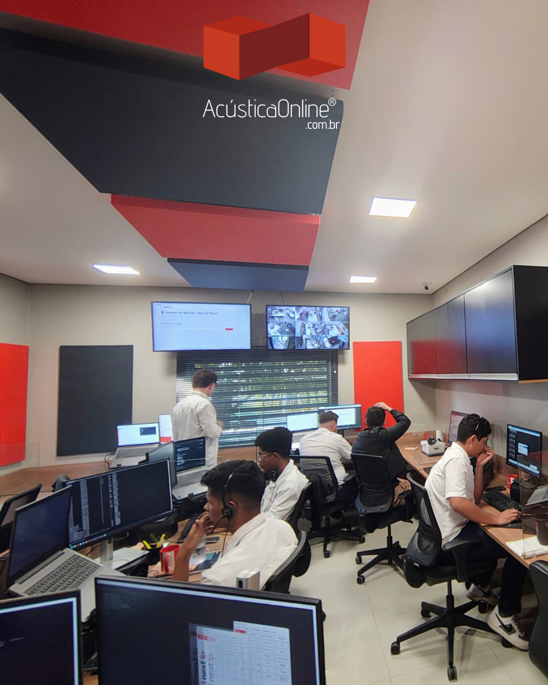 Painéis e nuvens acústicas dimensionados entregam resultado mensurável.